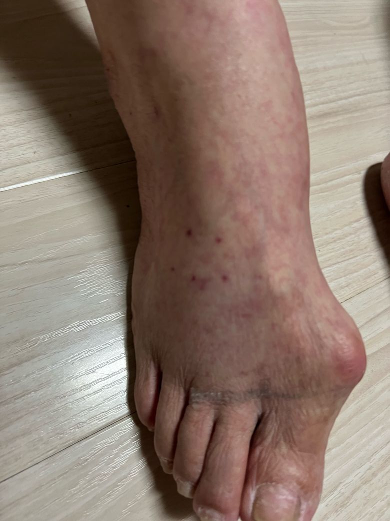 요약하자면 발이 심각하게 부어있고 발가락쪽 색이 변했으며 물이 나오고 있습니다.