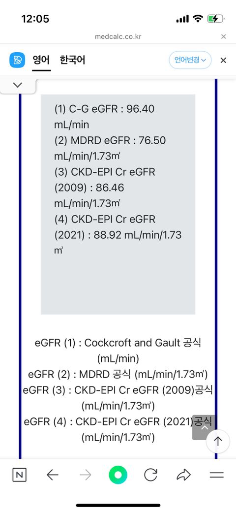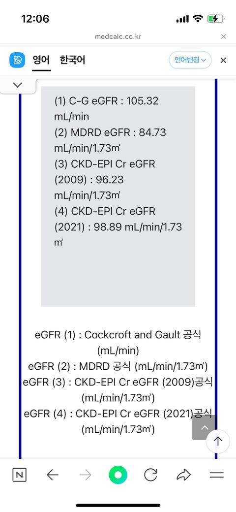 나온 방법입니다. 따라서 환자분이 이에 해당이 되지 않는다면 혈청 크레아티닌 serum creatinine 결과로 고려하셔도 됩니다.