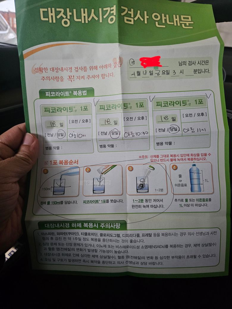 오후 3시 대장내시경 약이랑 물먹는 시간이 이게 맞나요?