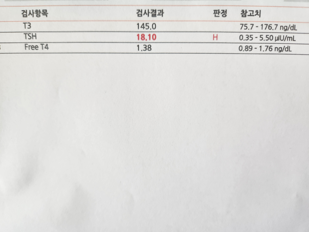 생각해보니 21년도에도 검사한적이 있었어요.그땐 TSH수치가 14여서 6갤뒤 재검사했을때 7로 떨어졌었고..그뒤로 처음 어제 검사했더니 저렇게 높은 수치가 나왔어요ㅠ