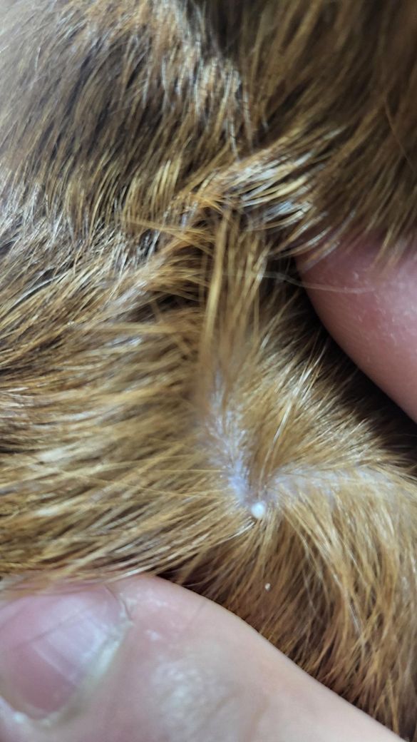 양상으로 보았을 때, 피지낭종(사람의 여드름) 가능성이 가장 높습니다. 피지낭종은 피부의 피지선이 막히면서 분비물이 내부에 갇혀 생기는 것으로, 겉에서 보면 하얗게 또는 살색으로 솟은 작은 혹처럼 보이며, 크기가 거의 변하지 않고 수개월 이상 지속되는 특징이 있습니다. 내용물은 피지와 각질 덩어리로, 겉보기에는 고름처럼 보이지만 감염이 아닌 단순 축적물인 경우가 많습니다. 이와 달리 진드기나 벼룩은 표면에 붙어 있고 크기가 미세하며, 움직이거나 눌렀을 때 떨어지는 형태를 보이므로 구별이 가능합니다. 고정되어 있고 하얀색이며, 주변에 홍반이나 가려움이 없다면 외부 기생충보다는 피부 내 피지샘 변화일 가능성이 높습니다.