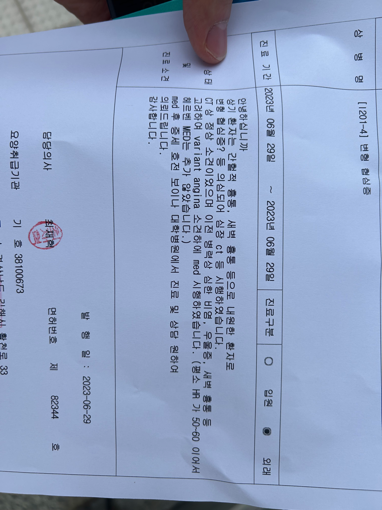 써주신 검사결과와 증상만으로는 변이형 협심증 가능성이 높아보이지는 않습니다.