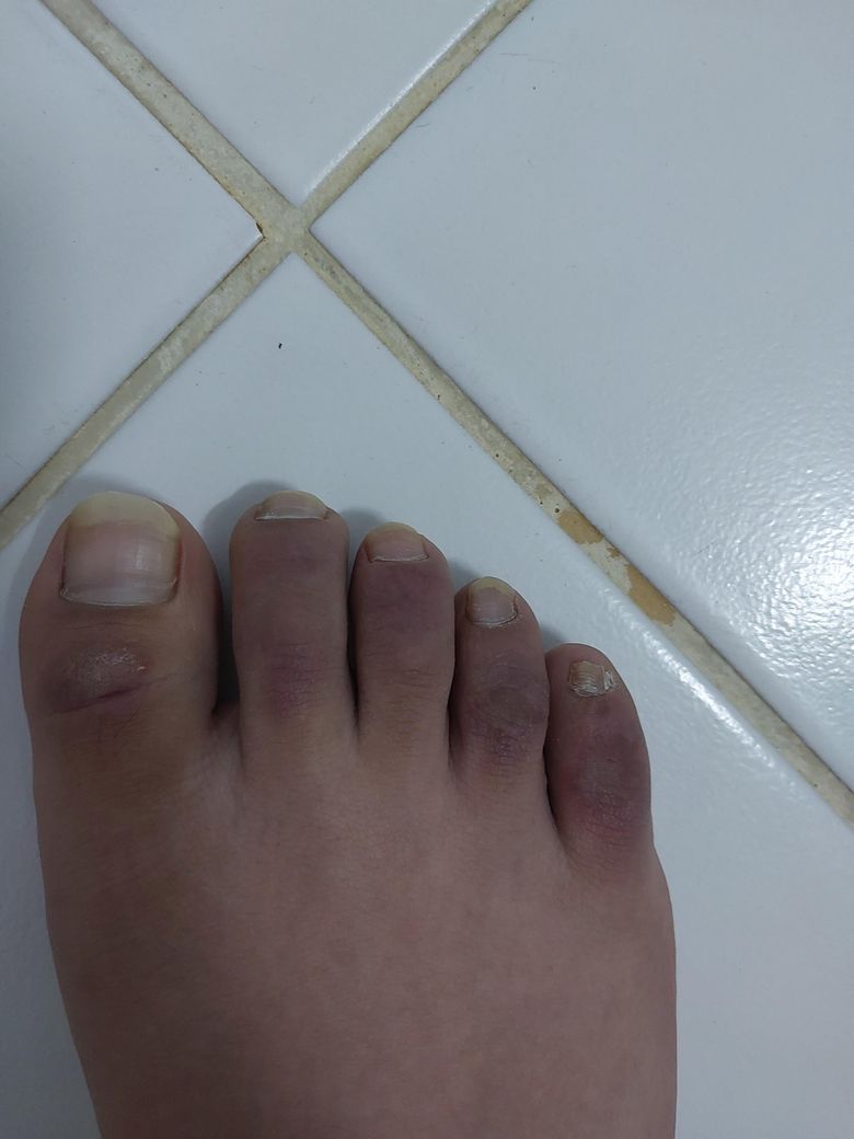 추운데 오래 있으셨나요? 원인은 불분명하나 혈액 순환 문제나 혈관 문제가 있는 듯 합니다. 혈액순환이 안되거나 혈관이 눌리거나 손상되어 피부 아래에 피가 고이면서 색이 변할 수 있죠. 또한, 감염이나 염증도 피부 색깔의 변화를 일으킬 수 있습니다. 이런 증상이 다른 발가락으로 확산되었다면, 혈액 순환 이상이나 다른 건강 문제의 징후일 수 있기 때문에 병원을 방문해 정확한 진단을 받는 것이 중요합니다
