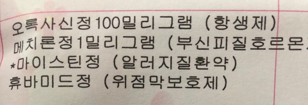 두 처방 모두 지르텍이나 알레그라 단독복용보다는 큰 효과를 나타내게 됩니다. 특히 염증이 이미 진행된 상황이라면 하단 사진의 처방과 같이 항생제나 스테로이드제의 복용이 불가피하게 됩니다.
