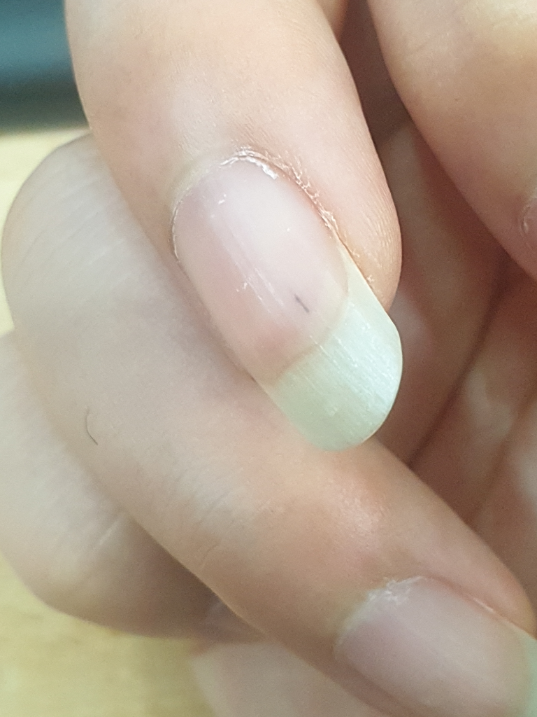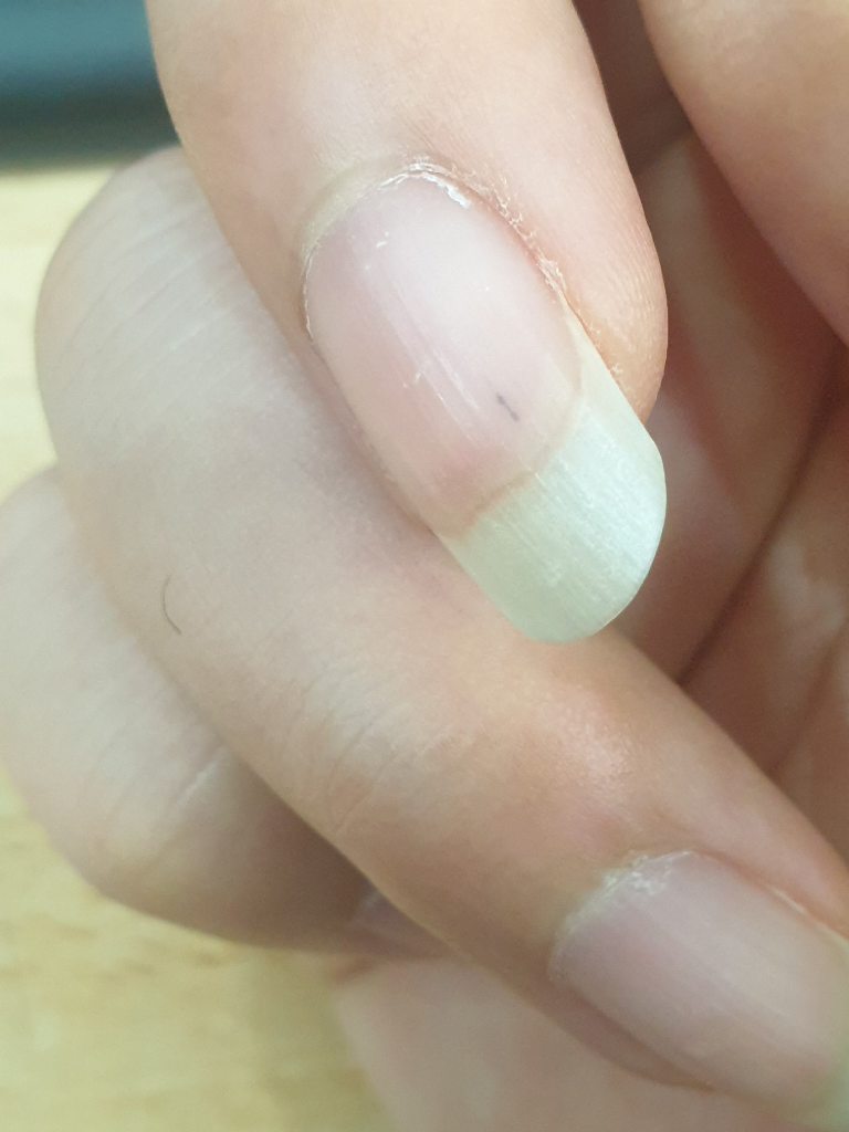 아마 손톱 밑으로 피가 고였던 것 아닐까 싶네요. 나쁜 것은 아니고 시간이 지나면 점차 없어질겁니다.