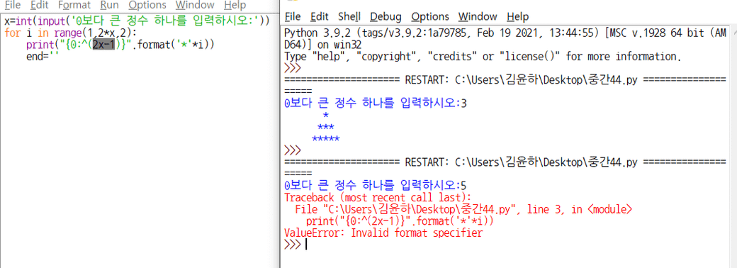 x = int(input('0보다 큰 정수 하나를 입력하시오:')) for i in range(1,2*x,2): y = "{0:^" + str(2*x-1) + "}" print(y.format('*'*i)) end=''위 구문과 같이 만드시면 동작합니다.