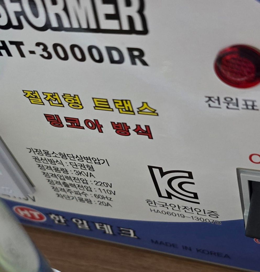 첫번째 사진의 변압기는 정격용량이 3KVA로 표시되어 있으므로 3KW 즉 3,000W까지는 사용이 가능합니다.