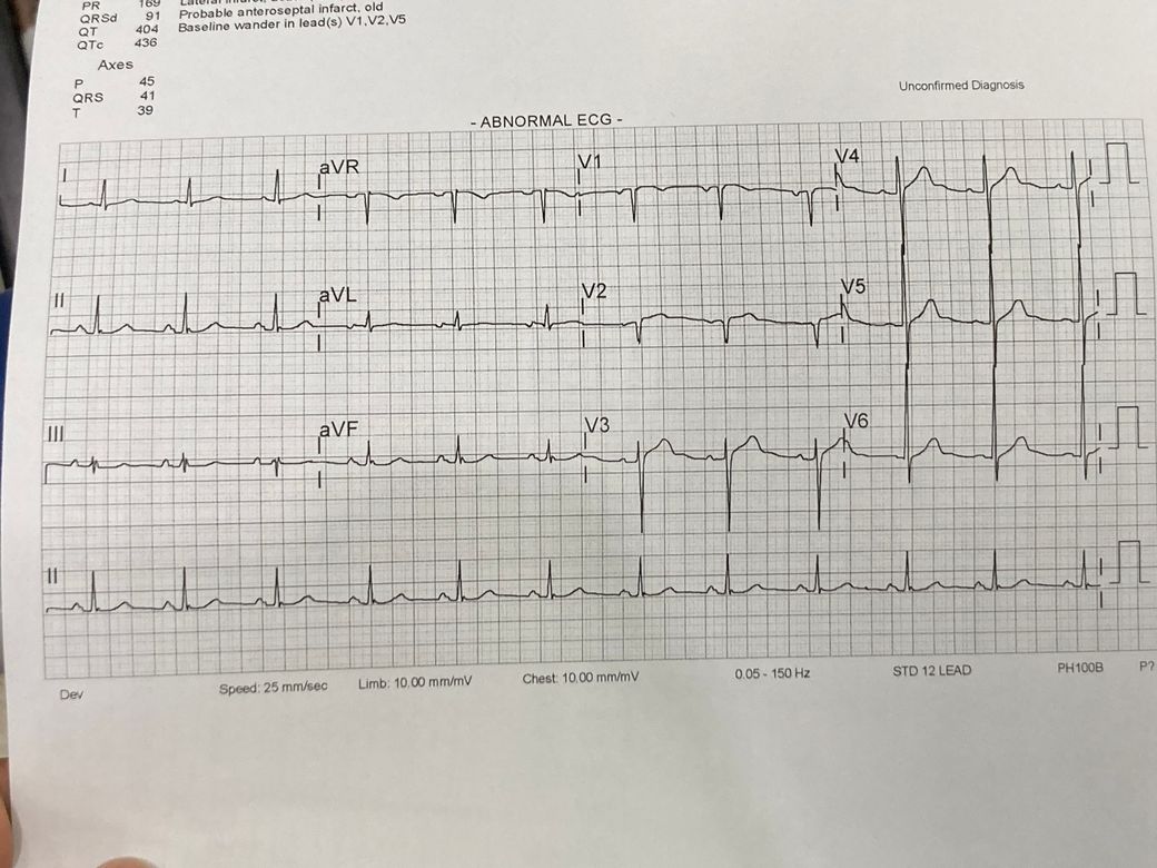 V2, V3 에서 ST 분절의 상승이 보입니다. 다만 과거의 협심증으로 인한 심전도 변화일 수도 있겠고, 현재 관상동맥의 상태가 안좋다는 것을 반영한 것일수도 있겠습니다. 따라서 현재 통증이 없더라도 흉통이 발생한다면 즉시 응급실을 가실 수 있게 주의하시는 것이 좋겠고, 무리한 운동을 하지 않으신다면 정밀검사를 받는 날까지는 괜찮으실수 있을 것 같습니다.