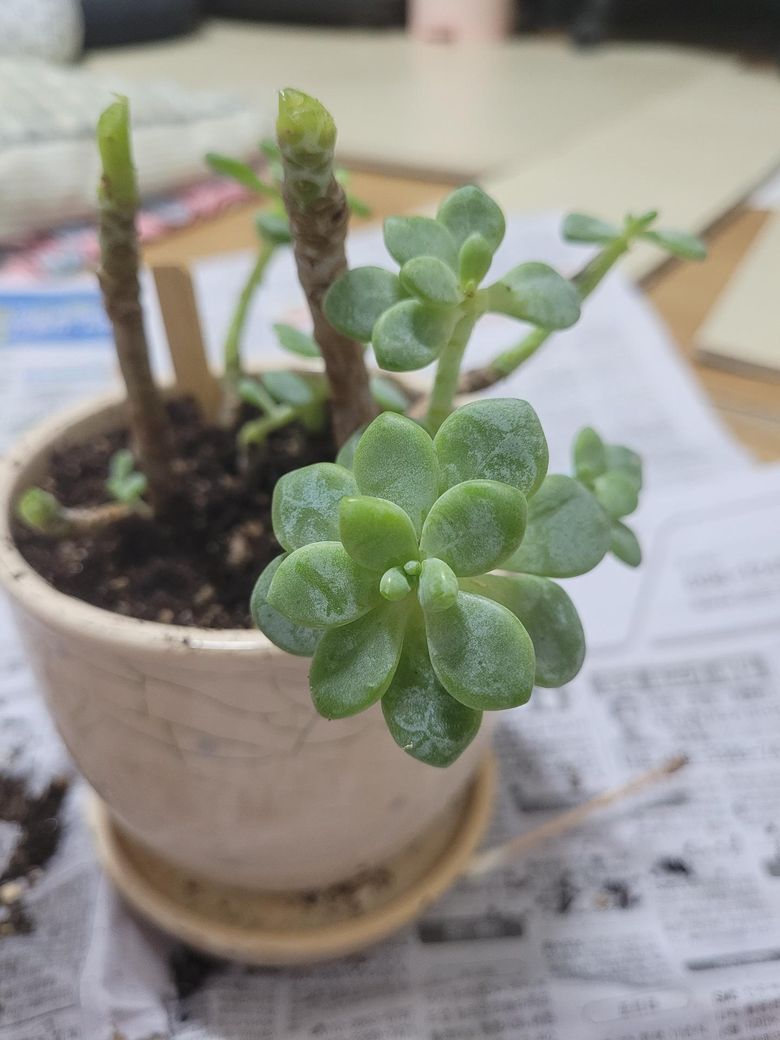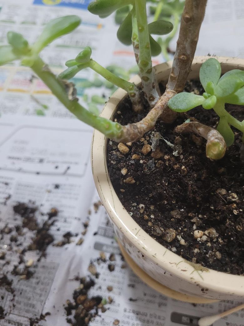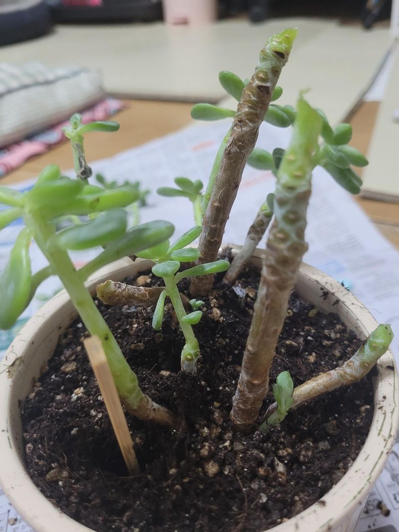 2) 갈색 줄기는 목질화된 오래된 줄기입니다. 다육이도 성장하면서 줄기가 단단해지고 갈색으로 변하게 되는데, 이러한 목질화된 줄기에서 초록색 새 줄기가 뻗어 나온 것은, 식물이 새로운 생장을 시작했다는 신호입니다. 나름 뿌리 부분이 건강하고 생명력이 있다는 증거이기도 하죠. 휘어져 자라는 것은 충분한 빛을 받지 못해 빛을 찾아가는 과정에서 나타나는 웃자람 현상입니다.