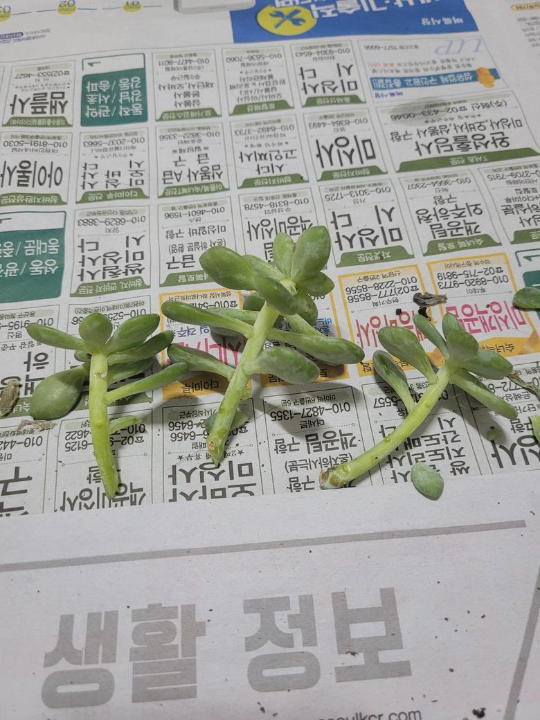 3) 잘라낸 줄기는 삽목을 통해 새로운 개체를 만들 수 있습니다. 우선 깨끗한 칼이나 가위로 줄기 아랫부분을 사선으로 자릅니다. 그리고 잘라낸 줄기를 서늘하고 통풍이 잘 되는 그늘에서 2~3일 정도 말립니다. 자른 단면이 아물어 딱딱해져야 물을 주었을 때 썩지 않습니다. 이후 배수가 잘 되는 다육이 전용 흙에 줄기를 꽂아주는데, 너무 깊이 꽂지 말고, 줄기가 쓰러지지 않을 정도로만 꽂아야 합니다. 그리고 약 1주일 정도는 물을 주지 않고 뿌리가 내릴 때까지 기다립니다. 그 후에는 흙이 완전히 마른 것을 확인한 후에 물을 주면 됩니다.