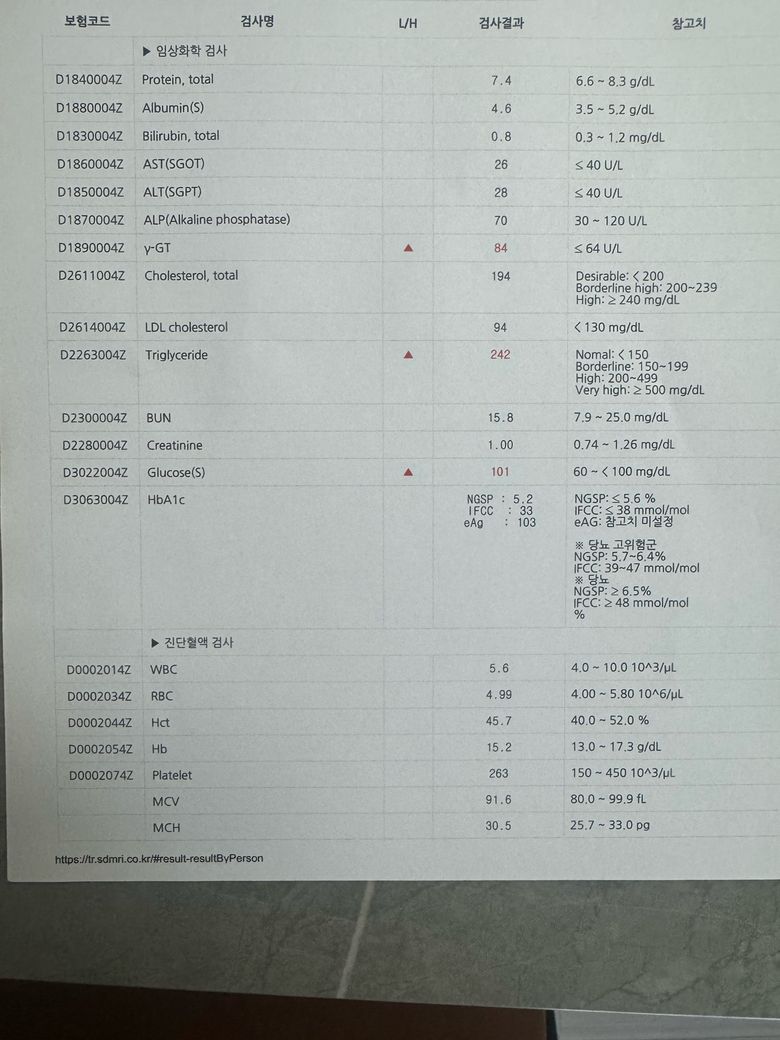 감마지티피, 중성지방, 그리고 혈당 수치가 조금씩 높은 상황인 것 같습니다. 당장 큰일이 날 것이다 어떻다 할 정도로 심각하게 수치가 높은 것은 솔직히 아닙니다. 그렇지만 병원에서 이야기를 해준 것처럼 금주, 금연을 하시는 것을 권고드리고 싶은 것은 마찬가지입니다. 당장 문제가 되는 것은 아니지만 방치될 경우 서서히 건강 상태가 나빠질 수도 있는 만큼 주의를 하시는 것이 좋겠습니다.