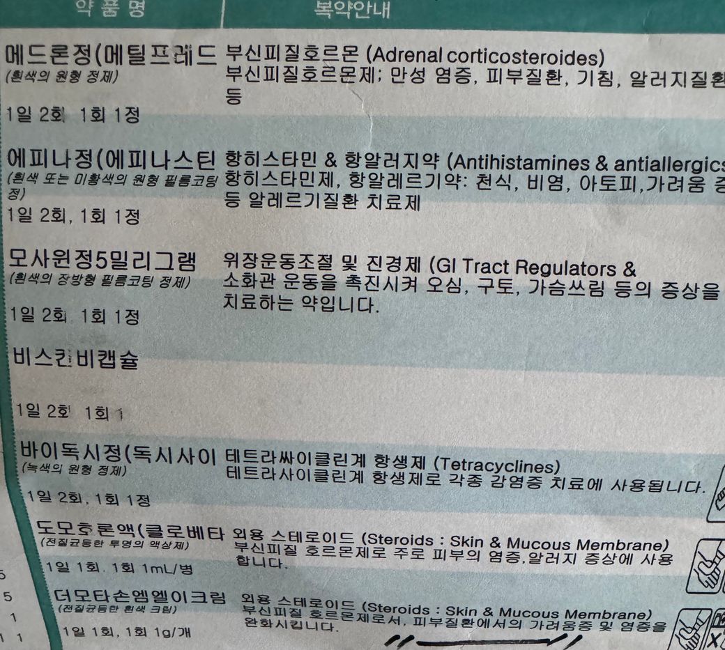 어제 피부염때문에 사진에 있는 약들을 처방받았습니다