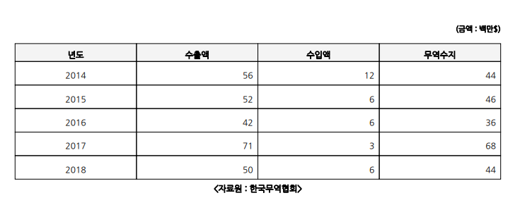 1. 2018년: 수출금액 $59,157,912, 수입금액 $6,647,851