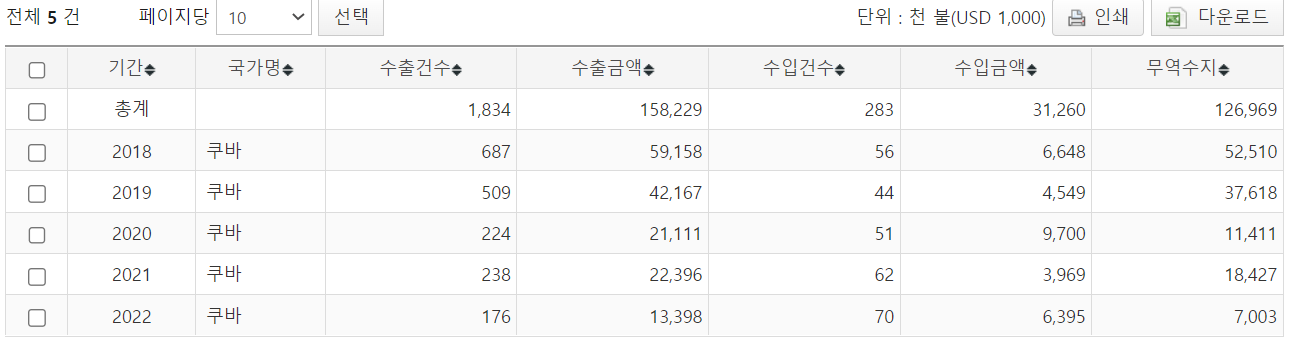 우리나라의 대 쿠바 수출입액은 아래와 같습니다.
