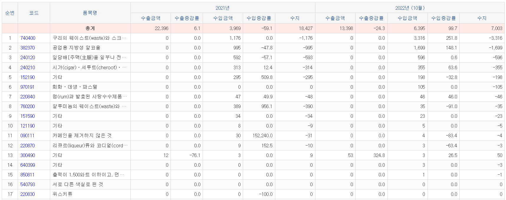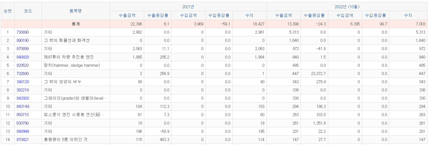 쿠바와는 거래량이 너무 적어 유효성이 있는 지표를 뽑아내기는 어려워보입니다만, 2022년 10월 기준 수출 금액순 자료는 다음과 같습니다.