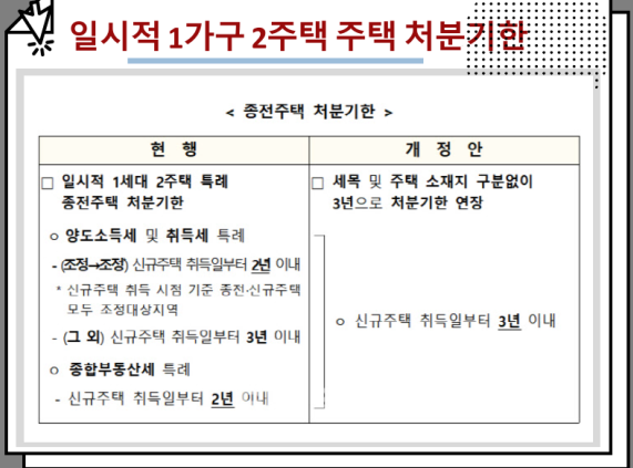 아래 내용으로 설명드리자면 신규주택 취득일로부터 3년이내 기존 주택을 매도해야합니다.