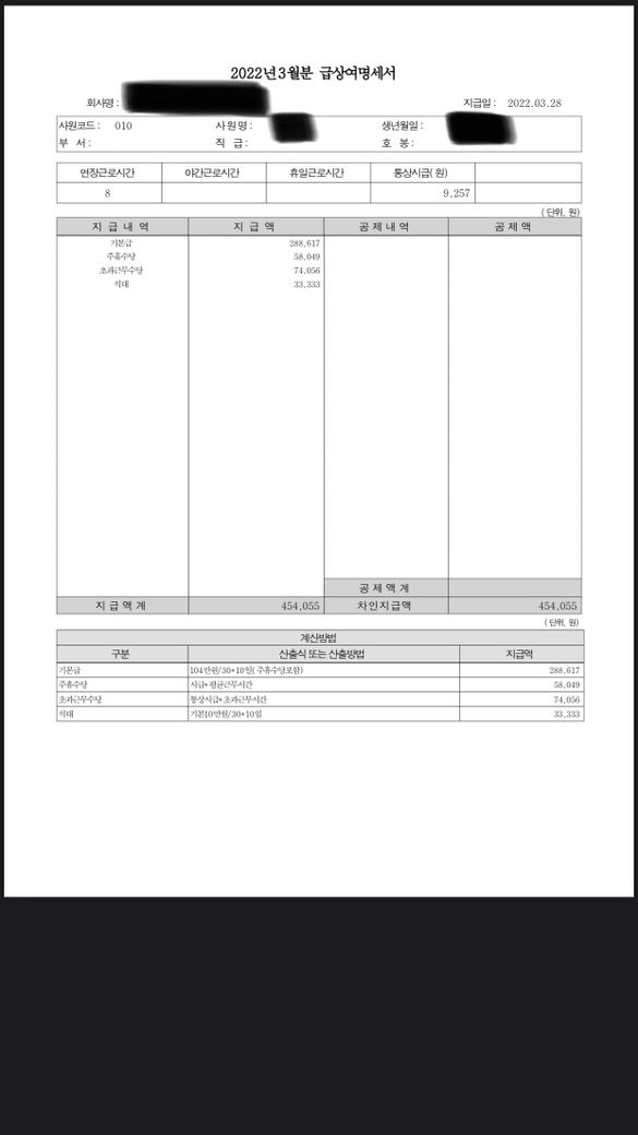 3월은 22일(8시간),23일(5시간30분),24일(8시간)을 근무했습니다. 이 다음 주에는 28일(8시간),29일(8시간),30일(5시간30분),31일(8시간)을 근무했습니다. 제가 처음 작성한 계약서와 3월분 알바비 급여명세서를 첨부했습니다. 혹시 제가 받은 알바비(454,055원)가 맞는지 확인해주실 수 있을까요? 그리고 알바비 계산을 어떻게 해야하는지도 알려주신다면 정말 감사드리겠습니다.