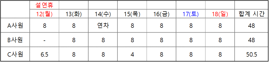 2. 결론은 위에 적어주신 A,B,C 사원 모두 한주 52시간 이내 근로이므로 법에 위반되지 않는다고 보시면 됩니다.