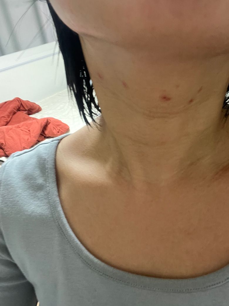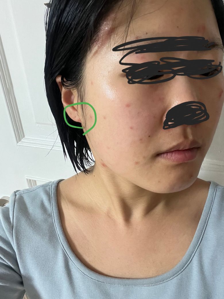 위와 같이 얼굴 전체와 귀, 목에도 해당 증상이 있습니다..