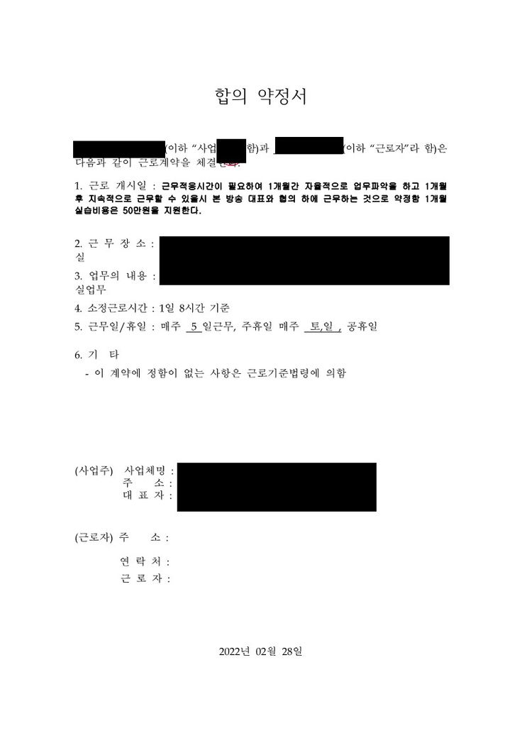 위에 올려주신 약정서와 급여이체내역 등 증거를 출력하여 사업장 관할 노동청에 진정을 제기하시길 바랍니다. 감사합니다.