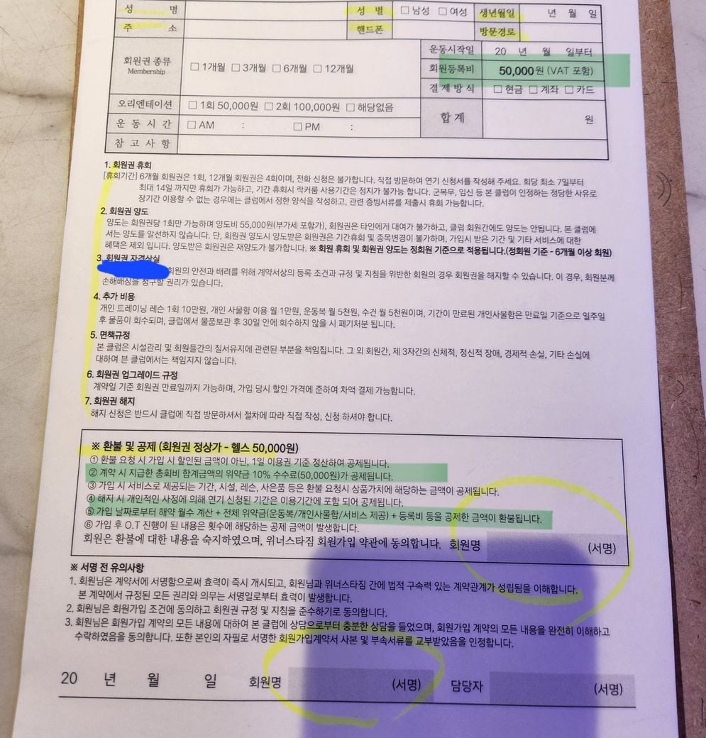 개인사정으로 헬스장 환불하려고 하는데 위약금 10% + 등록비 5만원은 공제된다고 합니다.