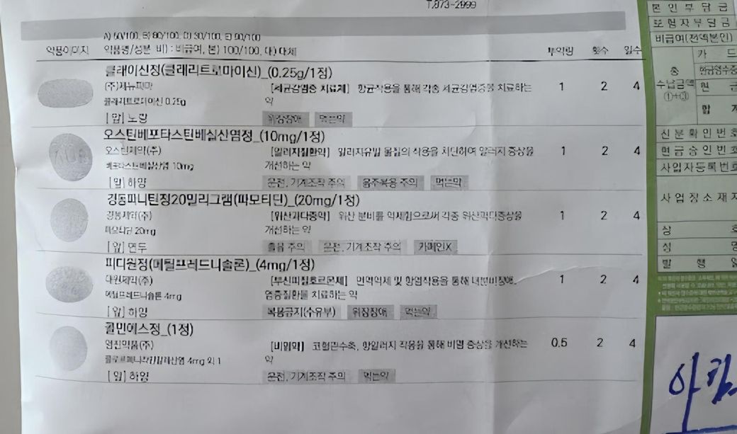 현재 처방받으신 약물중 클래리스로마이신 성분이 피임약성분의 대사를 방해하여 피임약 부작용 및 효능에 영향을 줄 가능성이 있습니다. 때문에 사실 기본적으로 동시 복용을 권해드리는 약물들은 아닙니다.