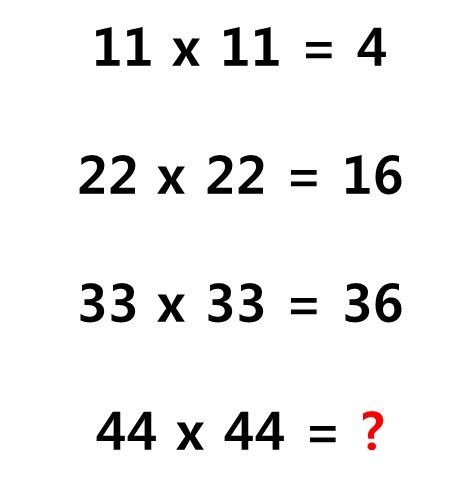 정답은 64입니다. 두 숫자를 더한 값을 곱하면 됩니다. 2 X 2 = 4, 4 X 4 =16, 6 X 6 =36 그리고 44 x 44니 8이고 64가 나옵니다.
