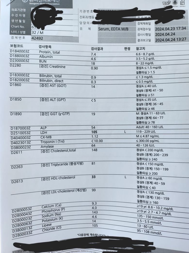생화학적 검사: 간 기능 검사인 AST, ALT, 및 GGT 수치가 정상 범위에 있습니다. 총 콜레스테롤과 LDL(저밀도 지단백), HDL(고밀도 지단백) 수치도 모두 정상 범위 안에 있습니다. 신장 기능 검사인 크레아티닌과 BUN(혈중 요소 질소) 또한 정상 범위입니다.