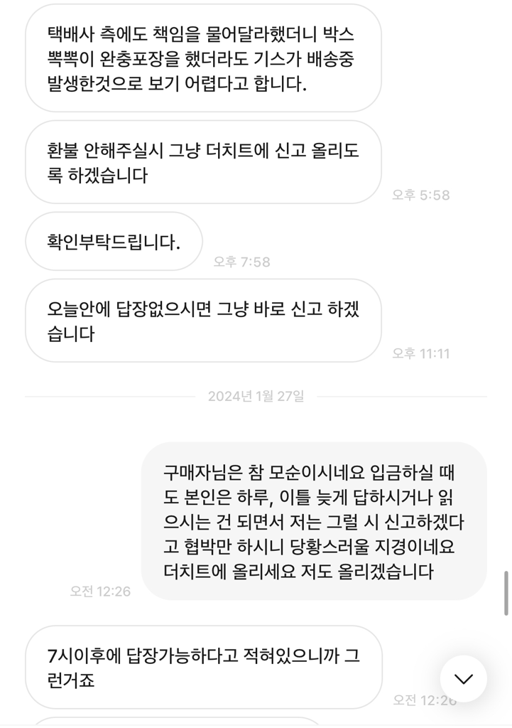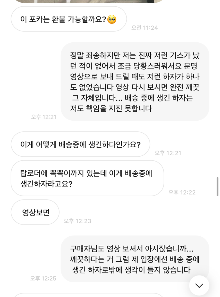 8. 배송 중 생긴 하자 혹은 구매자가 거짓말을 하는 것 둘 중 하나인 것 같은 의심에 배송 중에 생긴 하자인 것 같다고 말씀 드림
