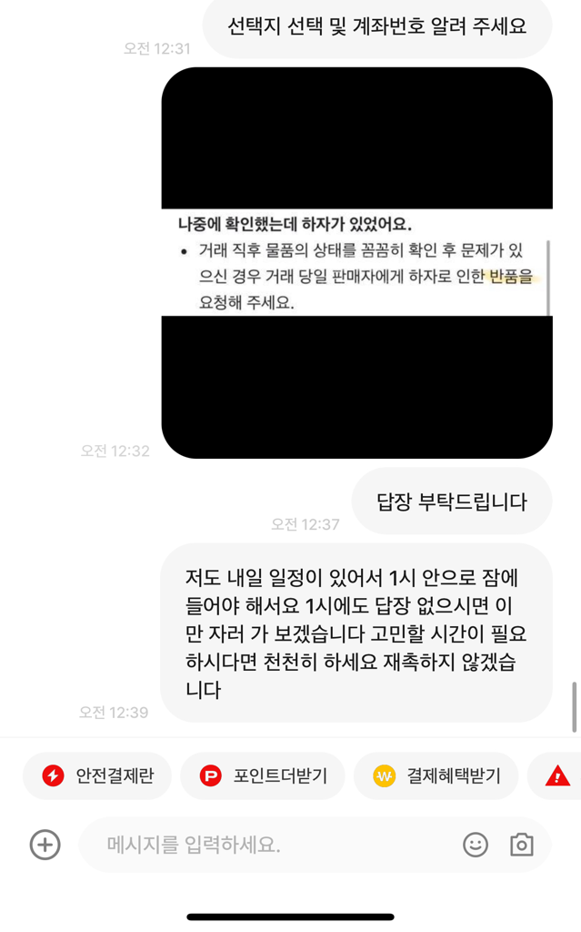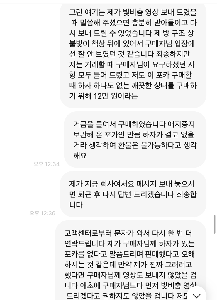 도대체... 어떻게 해야 하는 건가요? 정말 저는 판매할 때만 해도 하자가 없음을 제 눈으로 확인했는데... 영상 보시고도 여기 하자 있잖아요! 영상 다시 찍어 주세요! 이런 말씀 없이 구매하겠다고 하셨으면서 갑자기 영상에 하자 있다는 둥... 이런 말씀하시는데 도대체 어떻게 해야 하는 건가요...