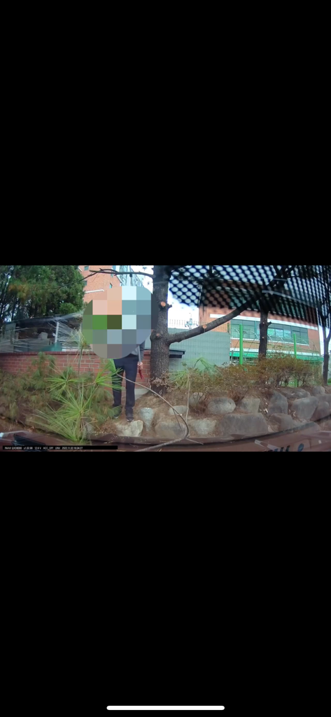 그러던 중 오늘 사건이 일어났는데 차에 타보니 충격 감지 녹화가 11건이 녹화되어 있고, 차량 보닛과 앞유리엔 소나무 잔재들과 송진으로 뒤덮여있었습니다. 녹화 된 영상을 확인해보니 어떤 남성분이 제 차량을 거의 '조준'하시고 소나무 가지치기를 하더군요. 나무가 차량에 쿵쿵 소리를 내며 떨어졌고, 그렇게 녹화된 주차중 충격감지 영상이 11개였습니다.