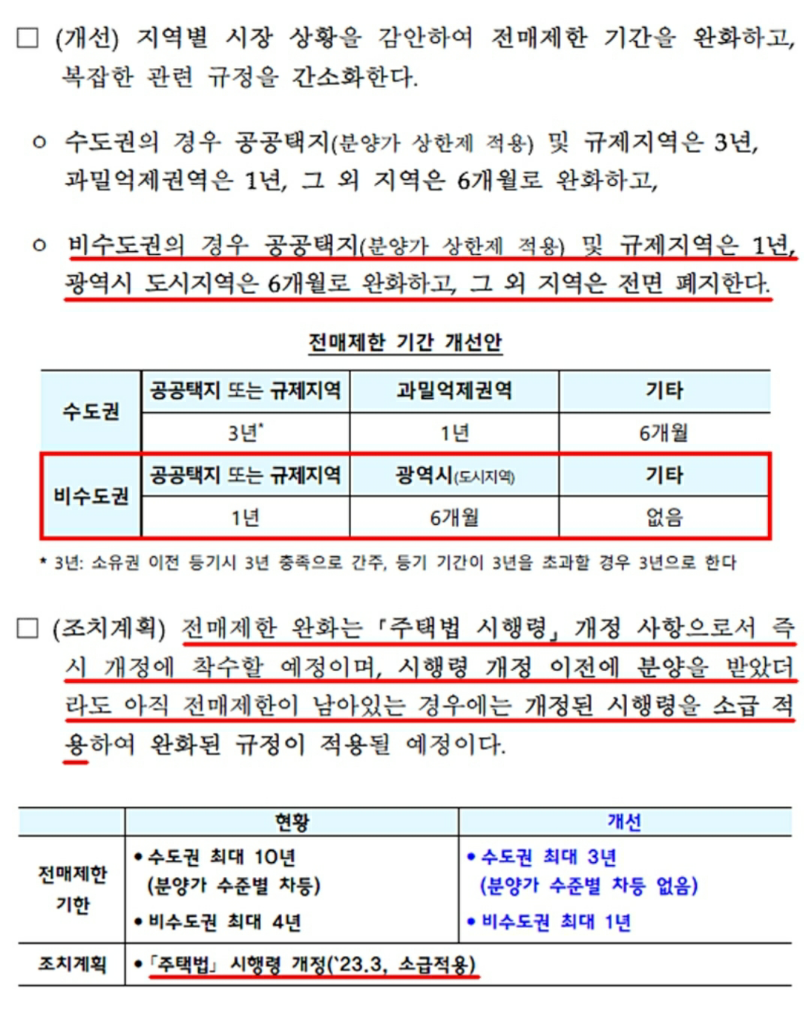 수도권의 공공택지 및 규제지역은 전매제한 3년, 과밀억제권역 1년, 그외 지역은 6개월로 완화 됩니다.