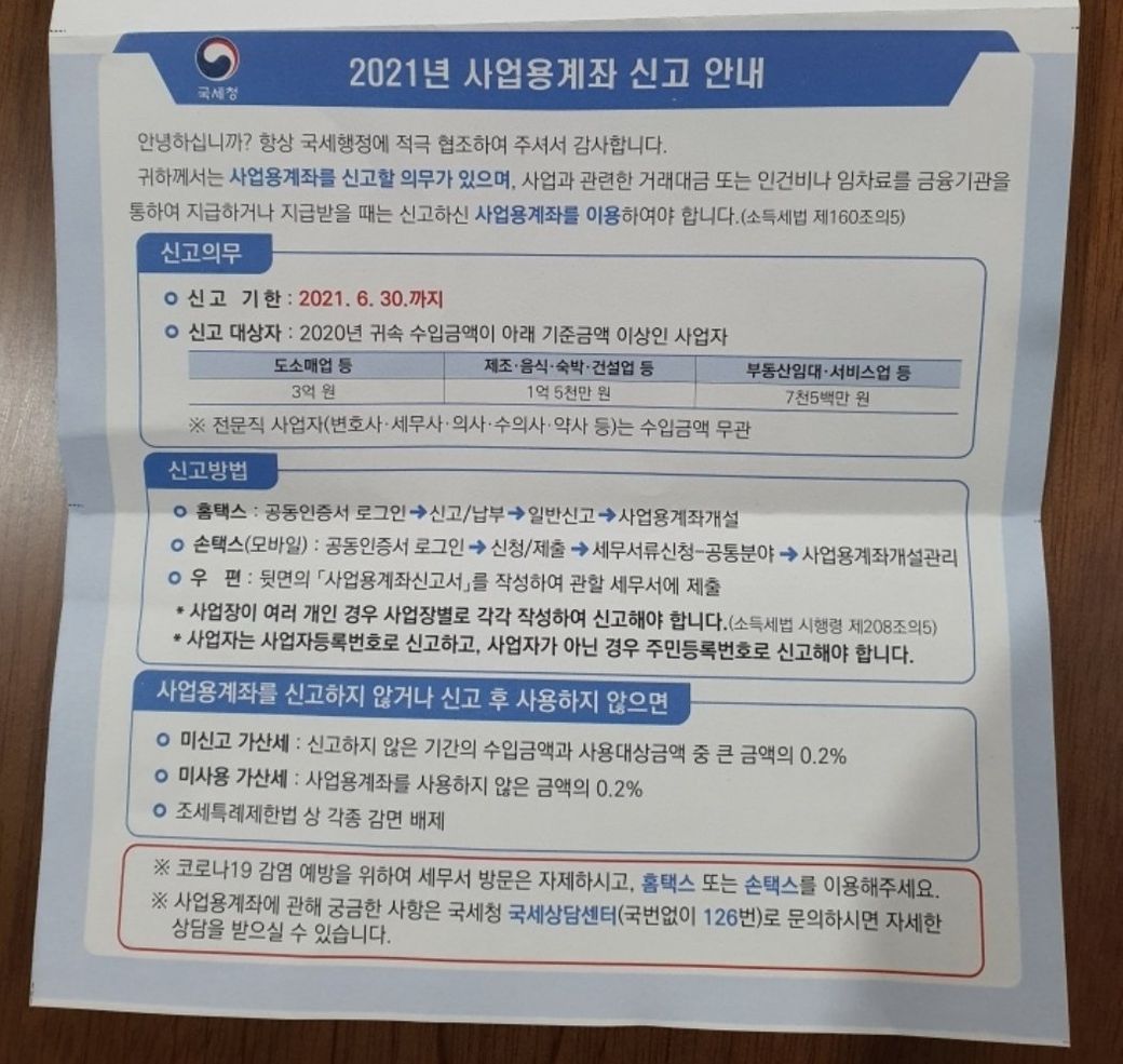 그런데 오늘 국세청에서 사업용계좌 신고 대상자라고 우편물이 날아오더라구요.