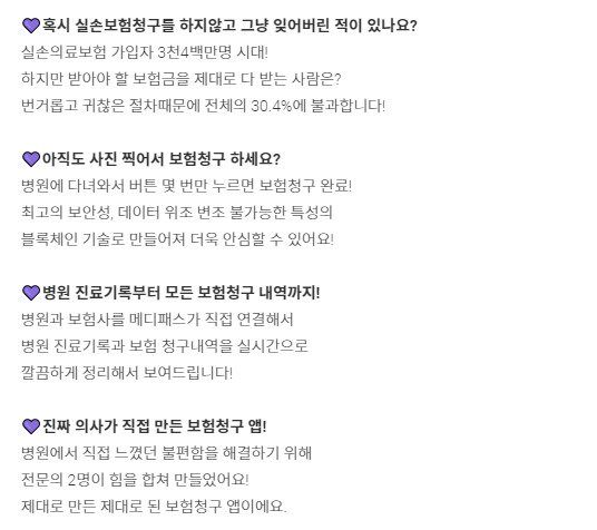 메디패스는 아래 보이는 것처럼 블록체인 기반의 보험청구 앱입니다. 아래 보이는 것처럼 진료이력,보험청구,보험청구내역까지 한번에 확인할수 있는 앱으로 의사 2명이 만든 앱이라고 합니다. 자세한 내용은 아래 내용을 참조하시길 바랍니다.