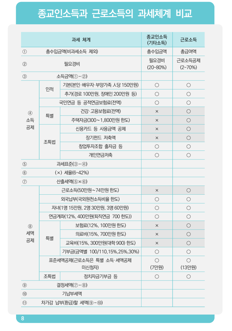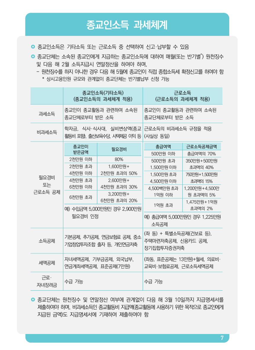 질문하신 내용에 대하여 아래와 같이 답변 드립니다.다음의 종교인소득 과세체계에 대한 국세청 발간책자의 내용을 참고하시기 바랍니다.