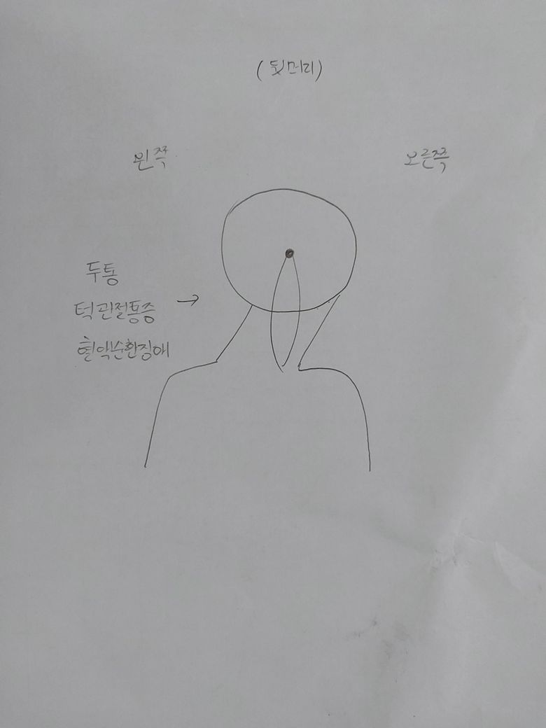편두통이 최근 계속 보이는데 통증보다 혈액순환문제로 눈에 이상이 갈수도 있다는 불안감에 고개를 2번째 사진처럼 돌리니 두통이 없어져서 일단 임시방편으로 하려고 합니다.