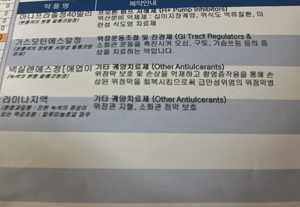 문의주신 내과약에는 위보호제 위주로 처방이 되어있습니다.