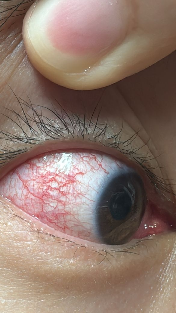 그리 심하지 않은 결막염이네요. 좀 침침하더라도 그냥 놔두면 자연치유될걸로 보입니다. 만약 더 심해지면 안과 치료 받으세요