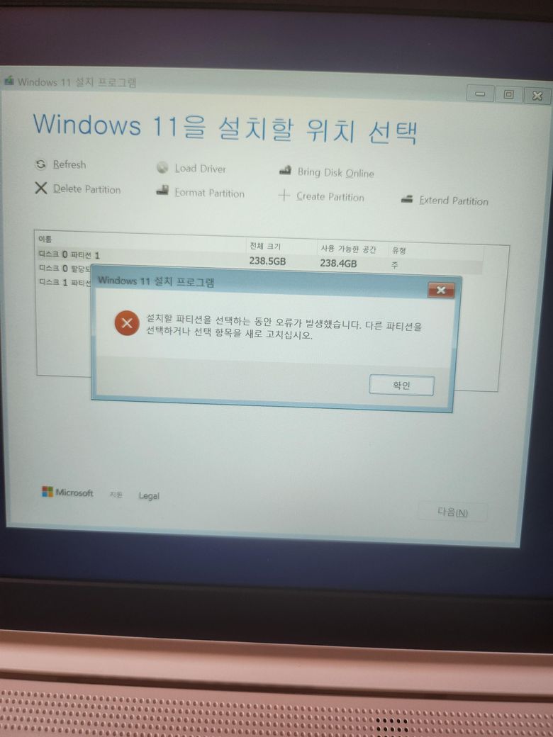 노트북 에 usb 를 꽂아서 윈도우 를 설치를 하는데 이런 화면이 뜨는데 어떻게 해야지 되는 건가요? 위에 있는 Format partition, refresh 를 눌러도 안되는데 왜 그런 건가요?