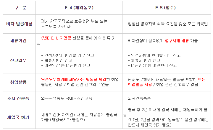 표면상으로는 F4(재외동포)나 F5(영주권) 차이가 크게 나지 않습니다.