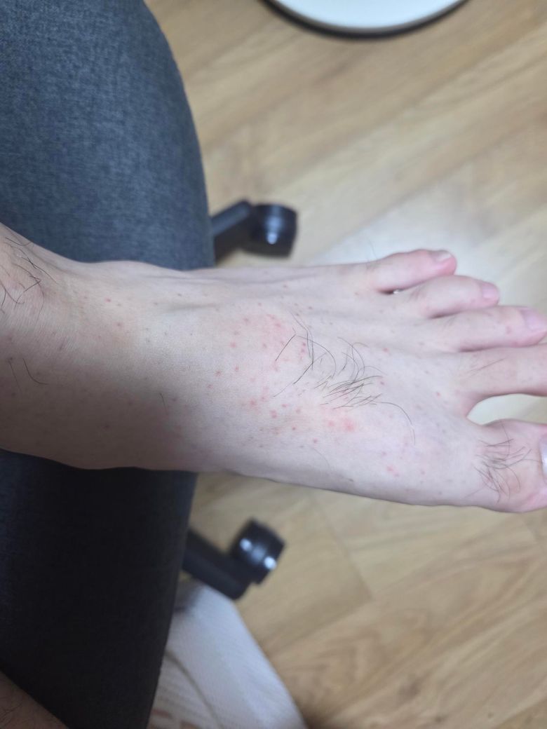 주말에 발열 증세가 나타났다가 하루 만에 호전되었으나, 현재 발등을 시작으로 붉은 반점이 나타나 손등과 무릎 부위로 확산되고 있는 상황입니다.