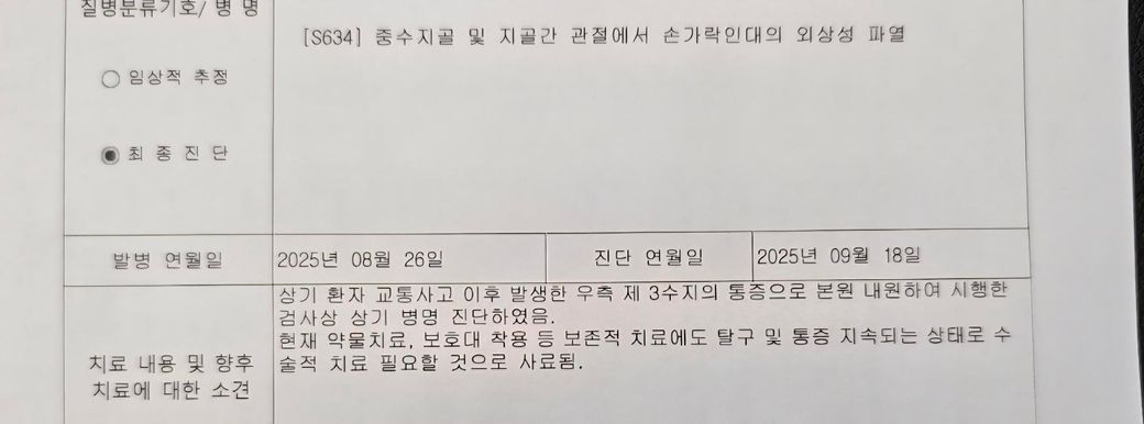 안녕하세요 다름이 아니라 8월 26일 퇴근길 사고를 당하여 저의 과실 0 상대방 과실 100으로 대물 접수 및 대인 접수 진행하였습니다 대물은 범퍼 교환 및 판금 덴트를 진행하였고 대인은 다음날 접수하여 생계유지를 위해 통원치료를 받고 MRI 소견과 진단서를 받아서 보험사에 제출하여 근 한달간 치료를 꾸준히 받고 있었습니다 보험사 기준 수술 시 9급 비 수술시 11급 나온다고 합니다. 그러던 중 금일 상대방이 그 정도 사고가 아니고 경미했다며 상대 보험사에 대인접수를 취소하고 저를 과잉진료 및 보험사기로 법원에 고소를 했다며 상대보험사측을 통해 연락을 받았습니다. 금일부터 진료비를 사비로 내야한다는데 제가 이런경우가 처음이라 어떻게 해야할지 몰라 도움울 구하고자합니다 제가 패소할 가능 성이 있나요? 진단서도 첨부해드립니다.