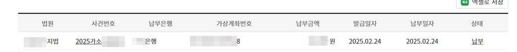 전자소송에서 나의전자소송>가상계좌내역을 보면 첫번째 사진처럼 오른쪽 끝에 상태가 '납부'로 표시 됩니다.