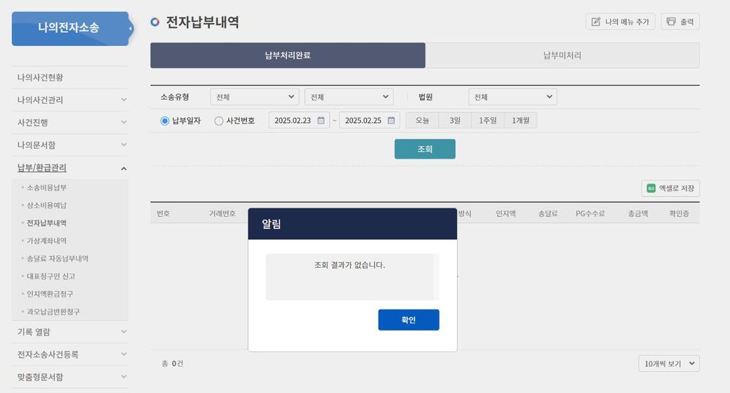 그런데 나의전자소송>전자납부내역을 보면 두번째 사진처럼 조회가 안됩니다.