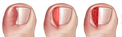 내성발톱이 심해지면 세번째 그림 같은 시술을 정형외과에서 시행할 수 있습니다.