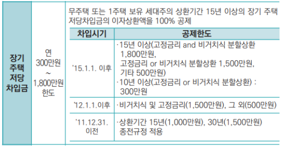 장기주택저당차입금에 대한 이자비용 전액을 소득공제받을 수 있으나 이는 해당 주택의 공시가격이 5억원 이하 (취득당시)인 경우로 차입금상환기간이 10년 이상 또는 15년 이상인 것이어야 합니다.