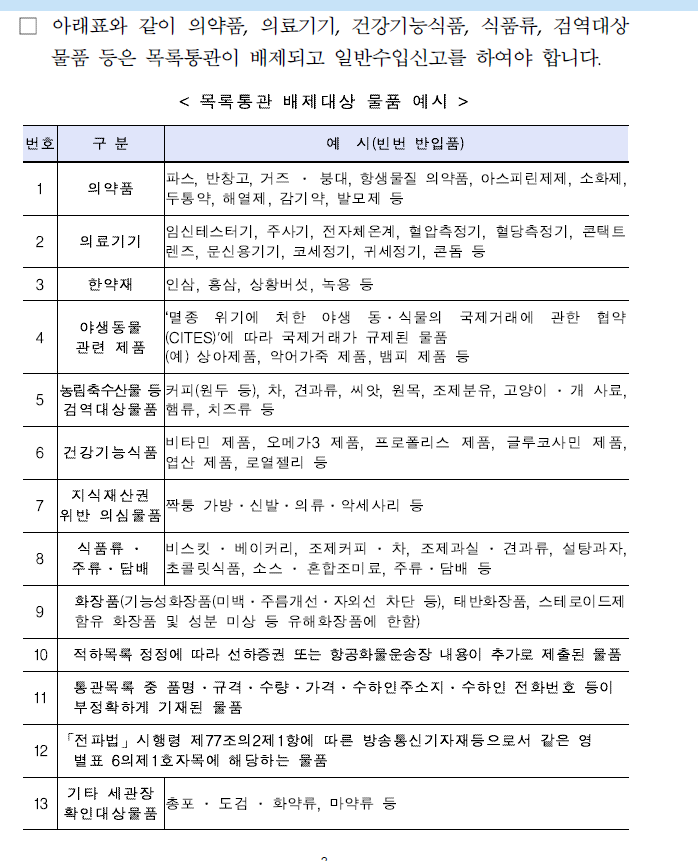 - 목록통관이 되지 않는 건을 대상으로 세관장에게 수입신고하고통관되는 제도