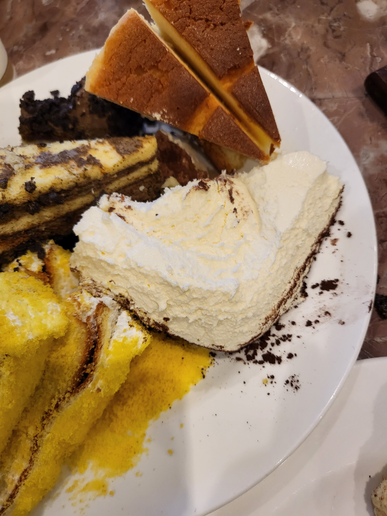 검은색가루와 흰색 크림을봐서는 생크림티라미슈 혹은 생크림케잌으로 보입니다.