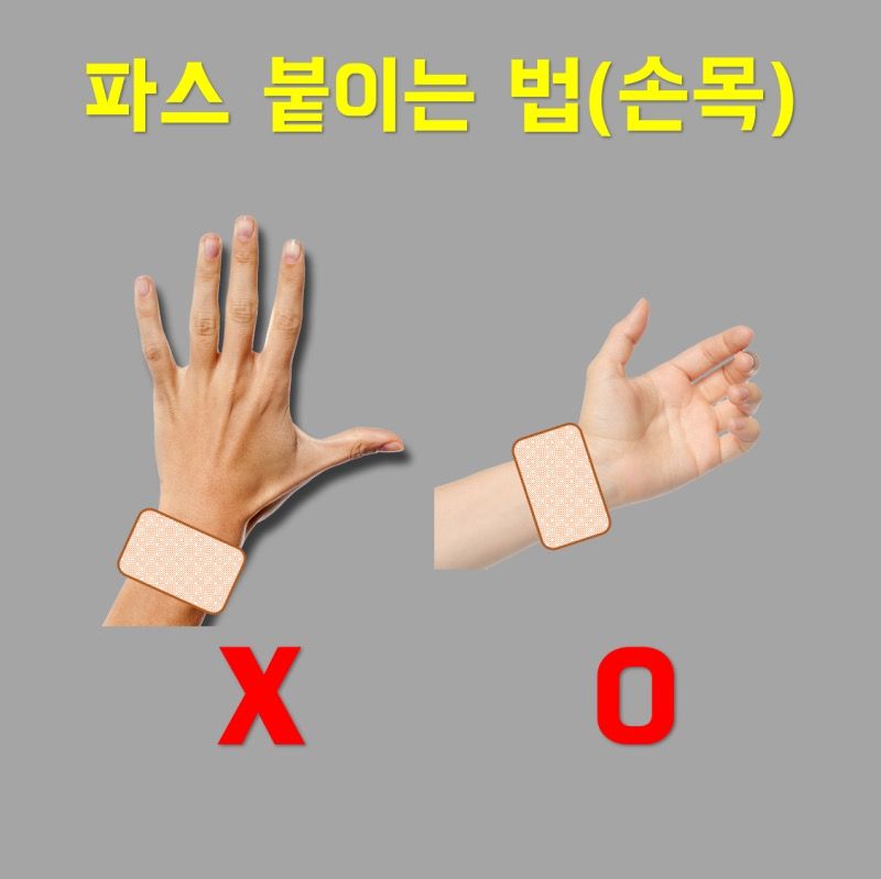 손목 안쪽에는 피부가 얇교 혈액순환이 원활하여 파스 성분이 빠르게 흡수되어 통증 완화에 도움이 됩니다.