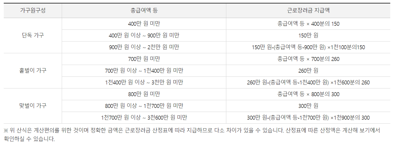 근로장려금은 가구원 구성에 따라 정한 부부합산 총급여액 등을 기준으로 지급액을 산정합니다.